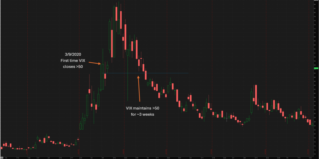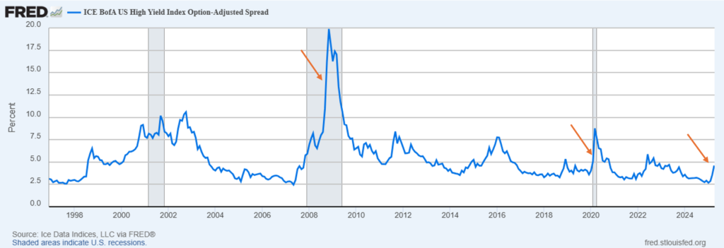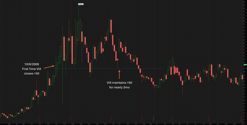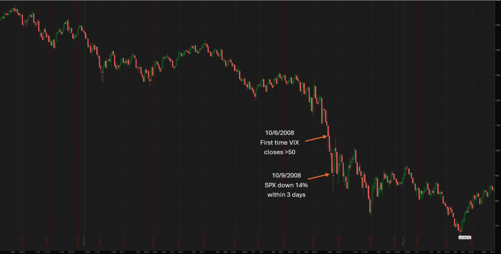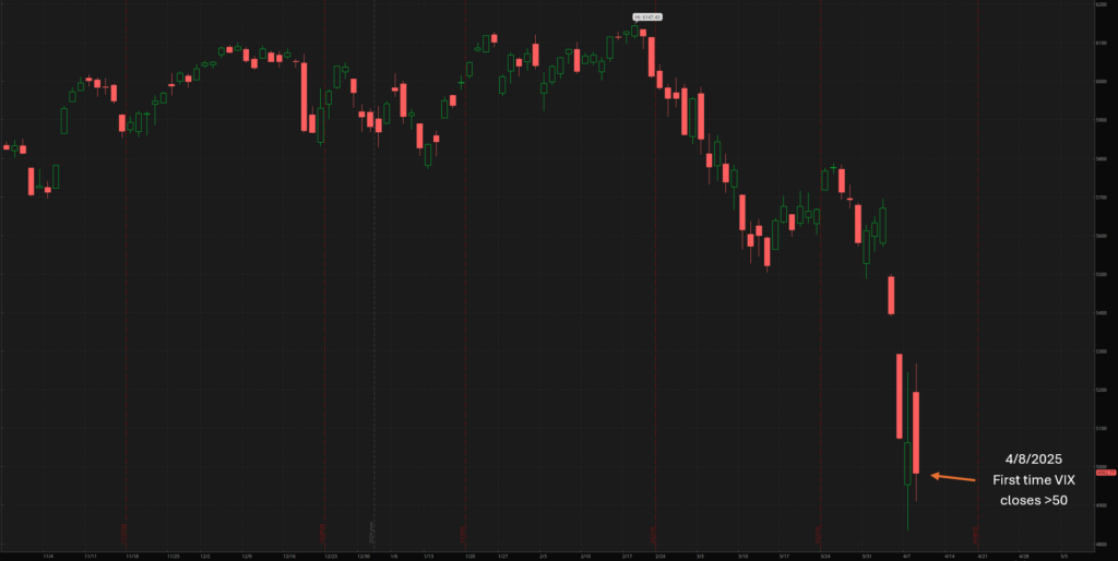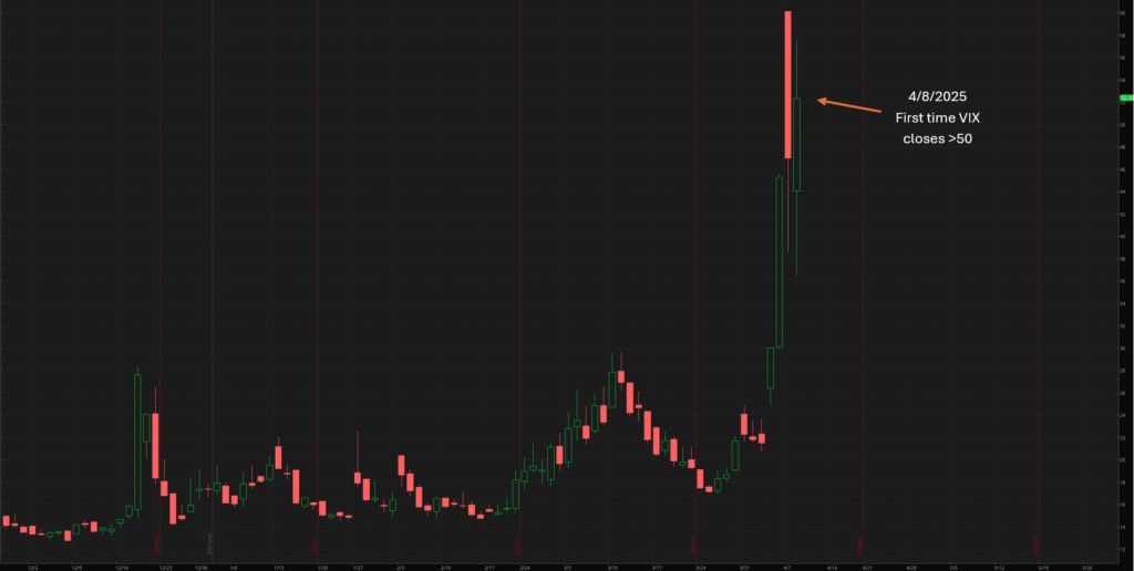 Yesterday the VIX, colloquially known as the “Fear Index”, closed above a critical level. 50. This marks an important milestone and crossroads for markets given the recent AI bubble/tariff-induced downswing and volatility. During the last two recessions, the first day the VIX closed above 50 (i.e. while VIX was “on the way up” and markets were “on the way down”) were ultimately important days and (unfortunately) only signaled more downside ahead. Within 3 days of the milestone, SPX closed down 10% or more. It’s clear it takes a substantial market move and significant event for the VIX to first close above 50. In 2008 SPX was down nearly 50% before the VIX crested 50 whereas in both 2020 and 2025, the SPX was down “only” 20%.